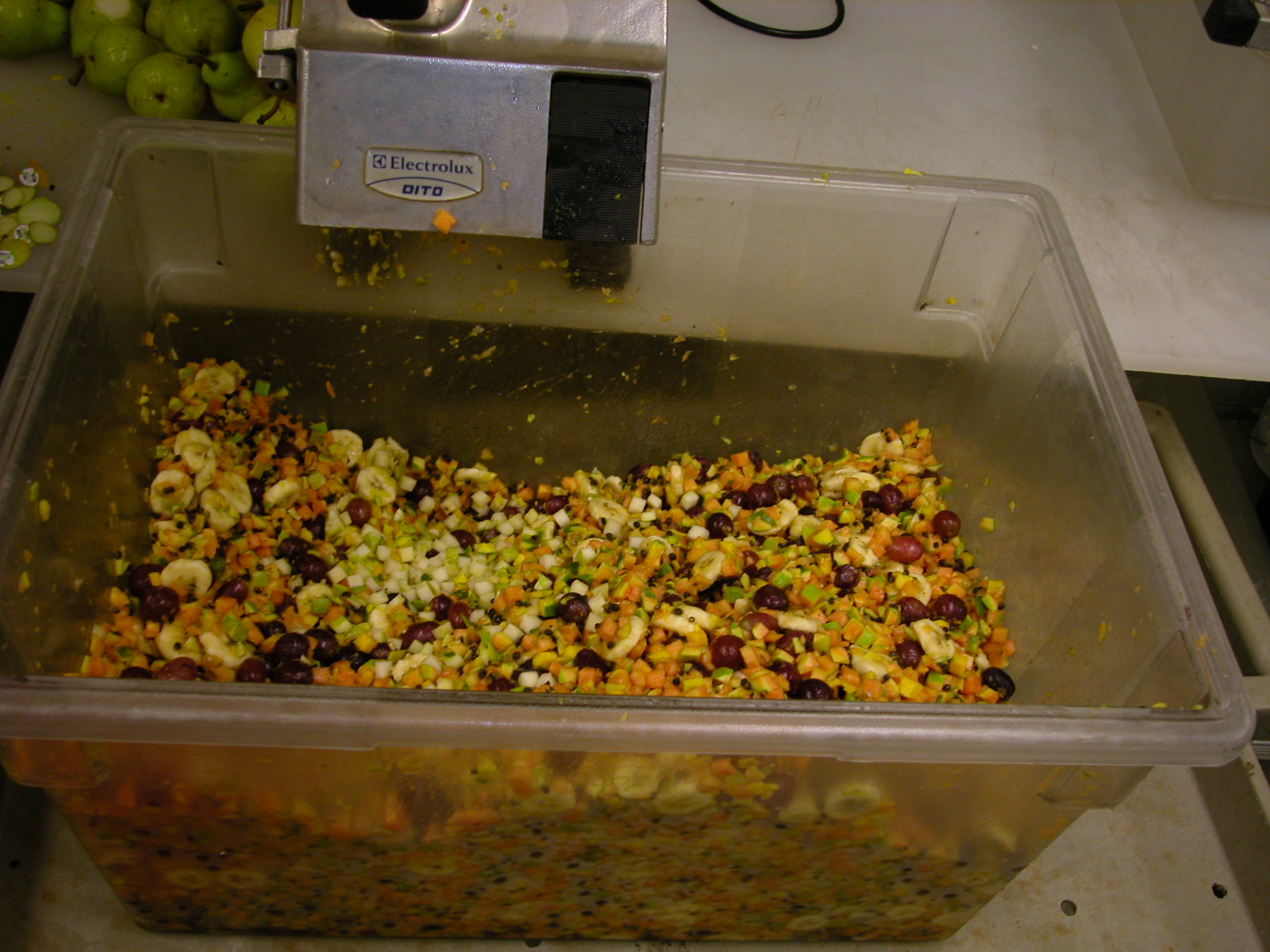 Lots of different birds get the all purpose fruit mix. Lorikeets, parrots, pretty much everyone but the penguins who receive fish, fish and more fish. Every day alternates between preparing either fruit or fish. If you can’t remember what day it is, fruit or fish, simply smell the shirt you were wearing the day before; if it smells like fish, then today you make fruit. Here’s what it looks like: