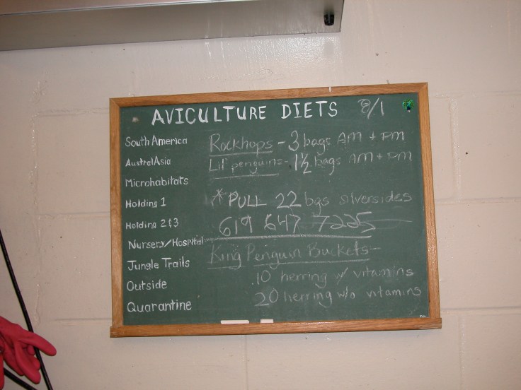 If you want to work at a Zoo because you love to be around animals, pick another field. You go days with only a glimpse of them because you are too busy prepping food for them or cleaning up after them. You are in service to them and that doesn’t include spending a lot of time goofing around with them. It’s a tight schedule and with around 200 separate plates, trays and buckets of food to prepare, a small staff, and yet more time being spent cleaning, you tend to work at an almost panicked, breakneck speed.