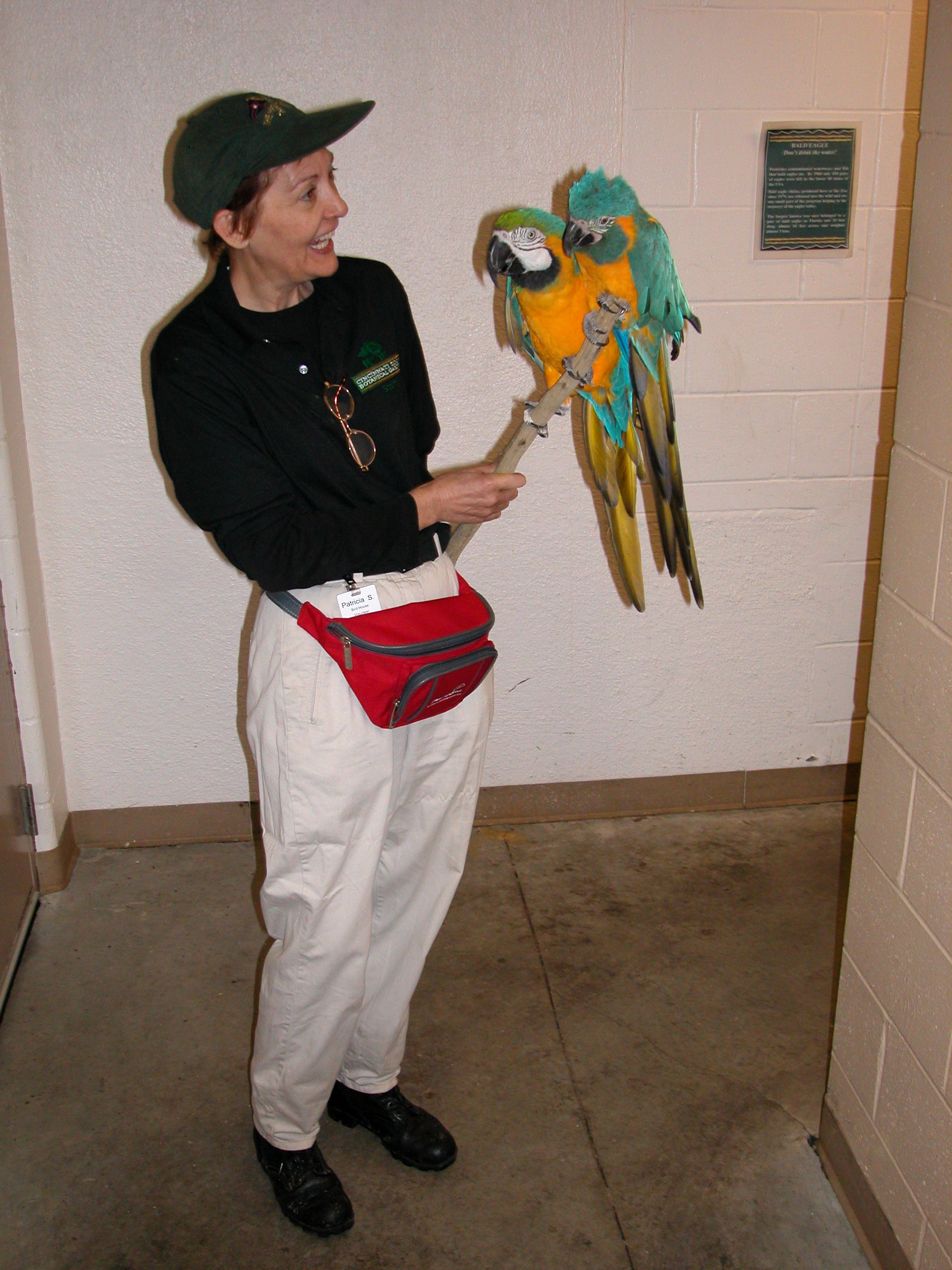 This is Max and Blue. They were on their way to their job at the entrance of the Wings of the World Exhibit. Their outdoor job is to meet and greet Guests as they enter the exhibit house. Max is of course a Blue & Gold Macaw and Blue is a Blue-Throated Macaw. They get along well together and are stick trained, and quite nonchalant about going up the elevator and out to do their work.