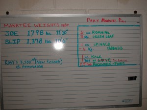 The incredible and very proud Keeper next to me is Lindsey, a Manatee lover from way back who managed to luck out and work with her first choice of “Houses”. It doesn’t always work that way. Keepers are hired based on need and you tend to go where there is a job. But Lindsey wanted the Manatee House and got it right off. She is talented, sensitive and knows her animals very well. Her work is all about the Manatees, water, pumps, temperature gauges, filtering systems and lettuce…Lots of lettuce. Here is a dry-erase board I saw in the backstage area of the Manatee House: