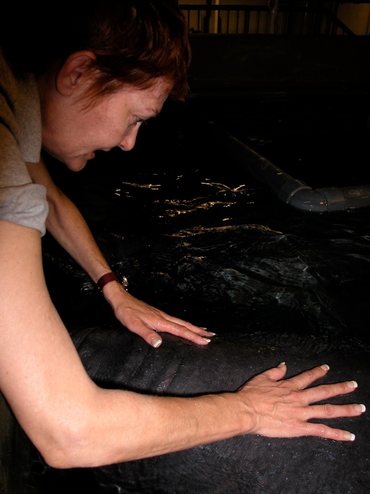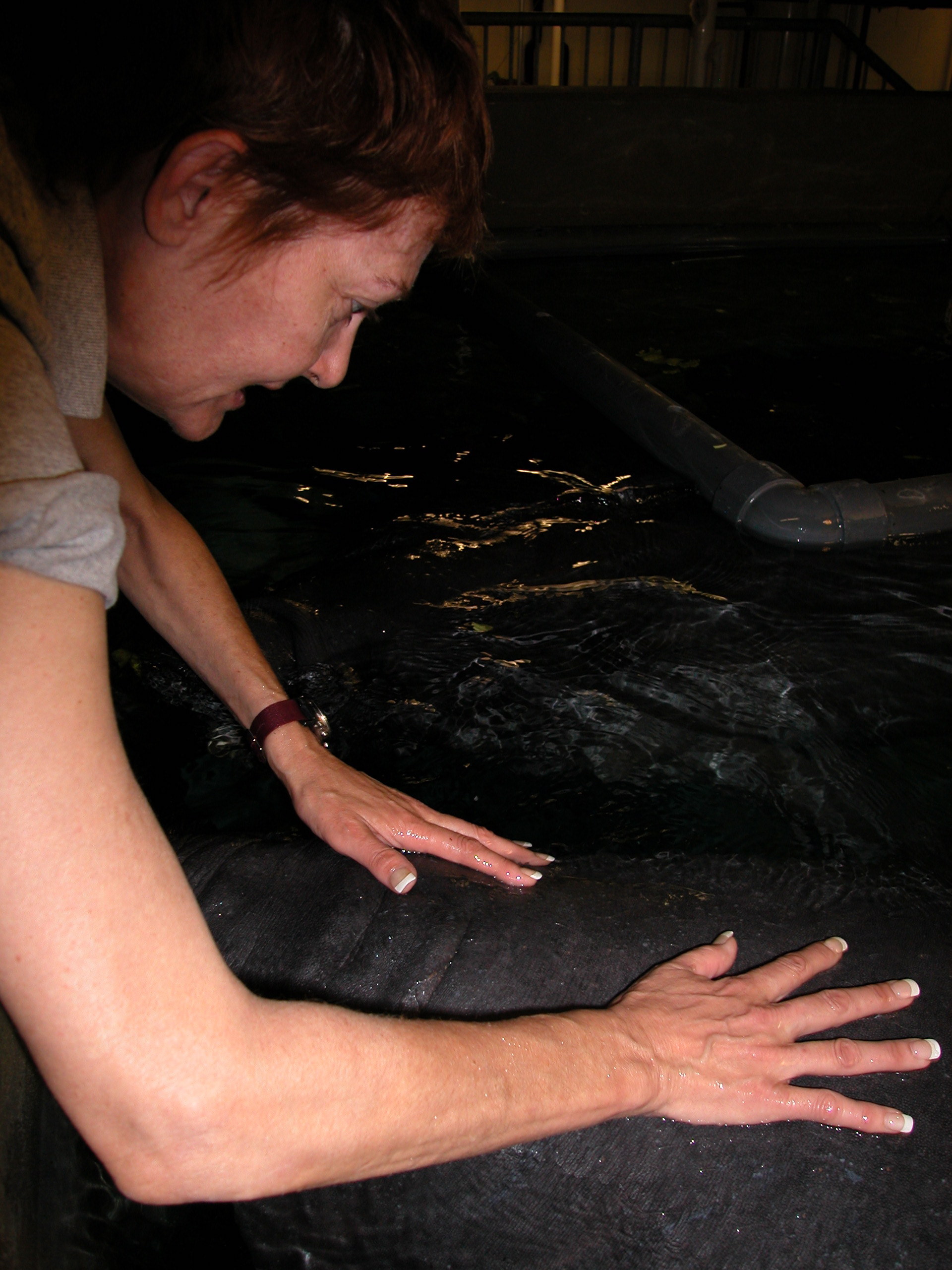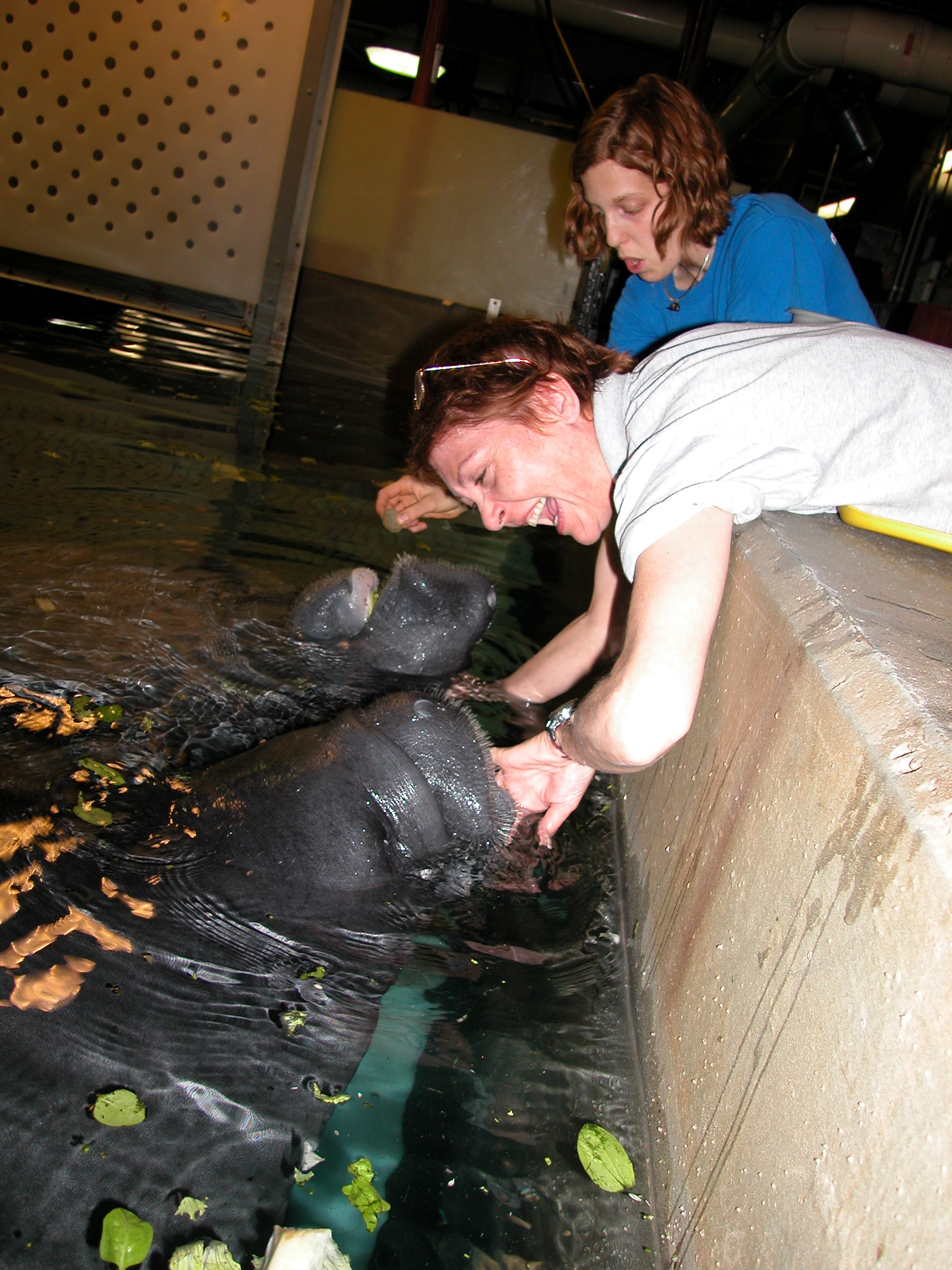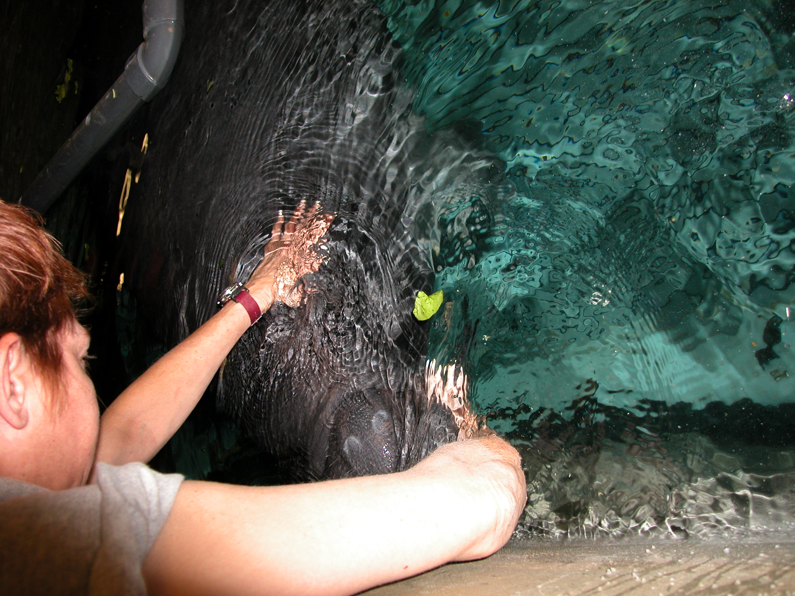 This has been an extraordinary vacation. I still have over a week to go and I have learned so much. These Keepers work their tails off and still find the time to humor me and my unending questions about them. I think they would rather talk about their animals and they aren’t very keen on being photographed. Kim in the Bird House just shudders when she sees me coming around with my camera; especially when she is thawing fish or tossing 50 pound crates of food around. They are a proud bunch and extremely devoted to their Houses and their animals. Lindsey incredibly is still happy and excited about her job with these huge guys. She loves them and it is obvious that they pay attention to her. While I was in the Manatee house moving around their pool, (120 thousand gallons) they quietly followed us, or Lindsey rather. They stayed near by, listening to our voices and and watching our movements. Their tanks are cleaned daily by volunteer divers who scrub down their tank and vacuum debris caused by Manatee poop and remains of 150 pounds of lettuce thrown into their tank every day. I was absolutely thrilled by this encounter and was humbled by the size and gentle manners of Lindsey’s incredibly graceful creatures.