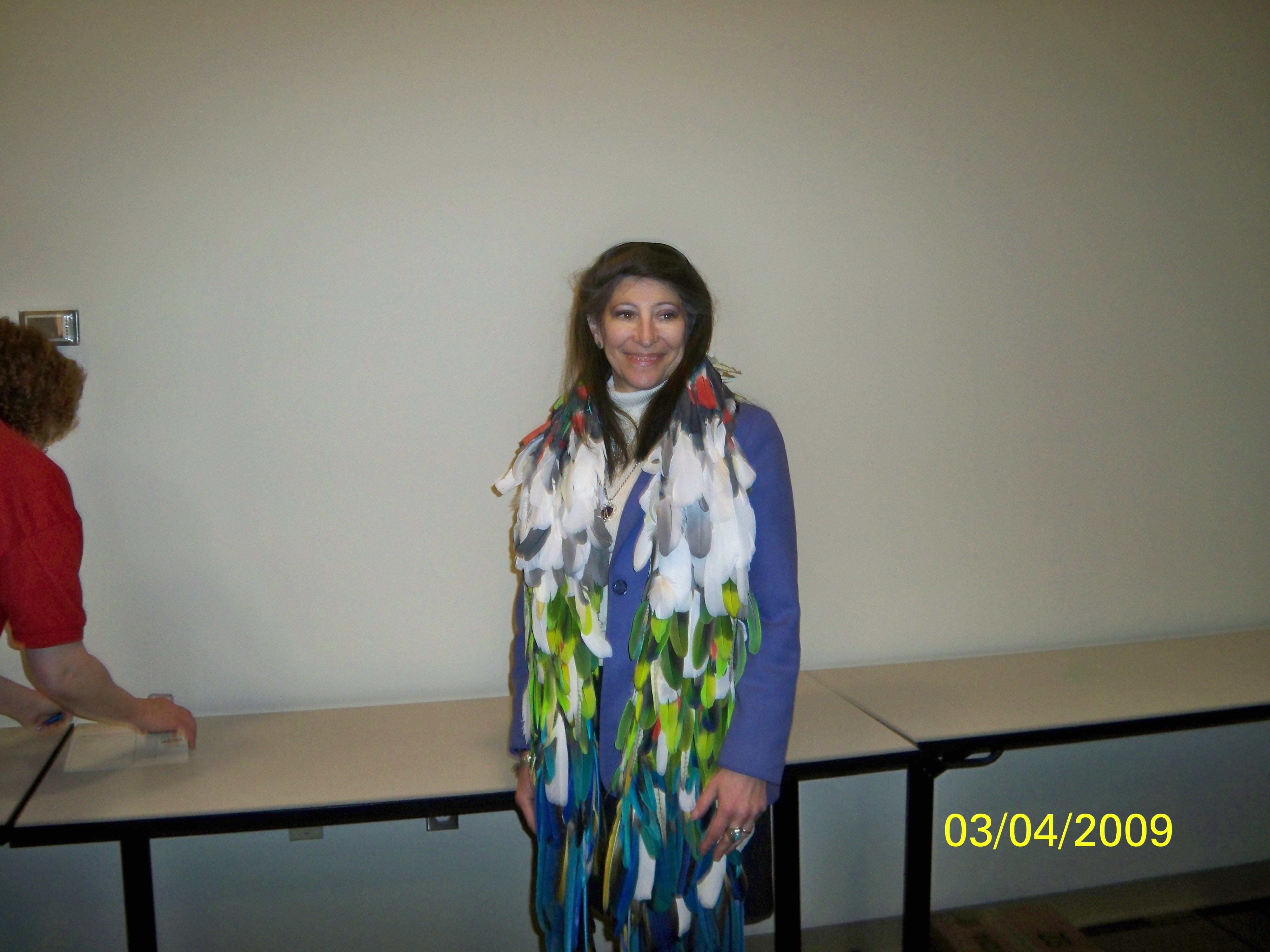 And one of my favorite people will be there! Yup! Dr. Irene Pepperberg will be on hand to keep everyone updated on her latest progress with her African Grey research. Here is Irene wearing one of my scarves at a Phoenix Landing Event: