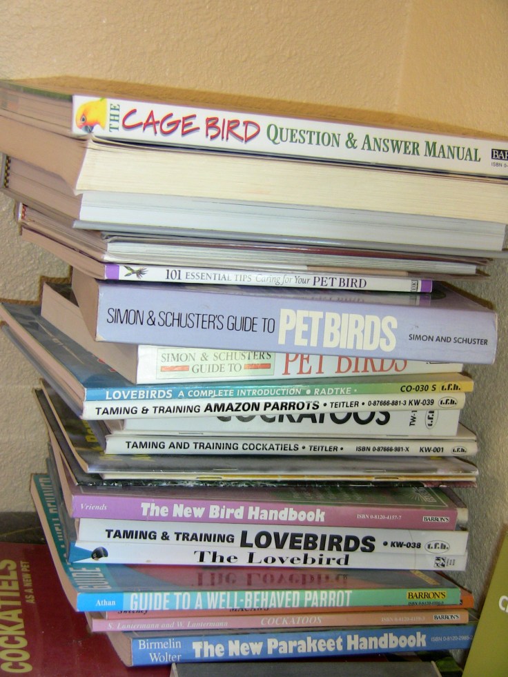 God knows I have a ton of them: Books on African Greys, on behavior training, diet, stories about parrots, handbooks. You name it, I’ve probably seen it, own it or I’ve read it. And the hits just keep on coming. I really enjoy reading and I’ve found that many other parrot people do as well.  And if a person who loves parrots can also read about parrots, well, they’re just thrilled. Reading is one of those things you can do sitting down and feel like you’re accomplishing something. You’re not really doing anything such as running a load of laundry or cleaning out a closet, but if someone calls and asks you what you’re doing and you reply, “I’m reading a book.” you can be sure you have left a better impression than saying you were watching Jerry Springer.