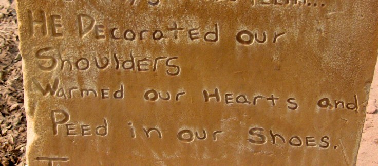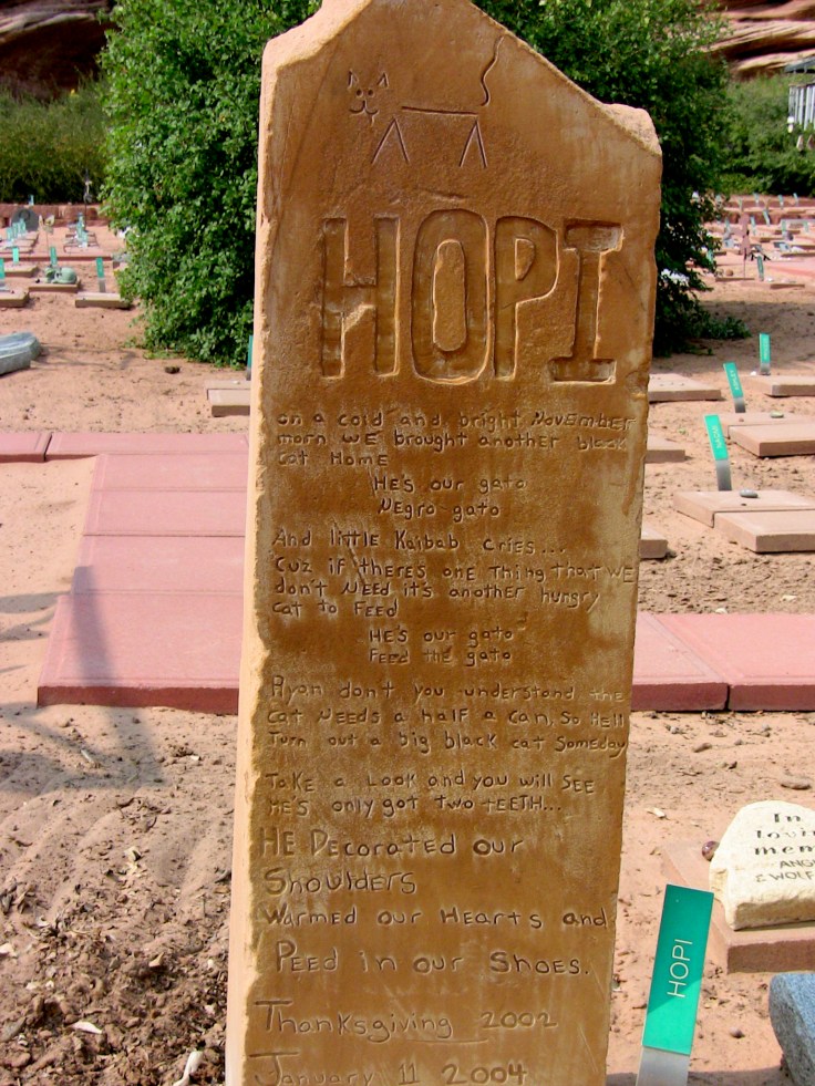 I know damn well it won’t last. And I don’t care. Because in the end, it’s worth it. I feel just like the people who hand-carved the stone in the photo at the top of this post for their cat, “Hopi.” When he passed, this was the memorial for the stray cat that walked into their lives, peed in their shoes and crawled into their hearts. Cat, dog, bird, bunny, it doesn’t matter. What matters is that they matter to us. And we’re better for having been here with them.