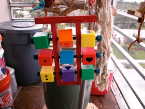 Do a little dumpster diving and collect odd items like water bottle caps, pieces of raffia, tree branches from bird safe trees, pieces of cardboard and old plastic clothesline. With these items, attempt to make an interesting toy. You have 8 minutes. You may begin.