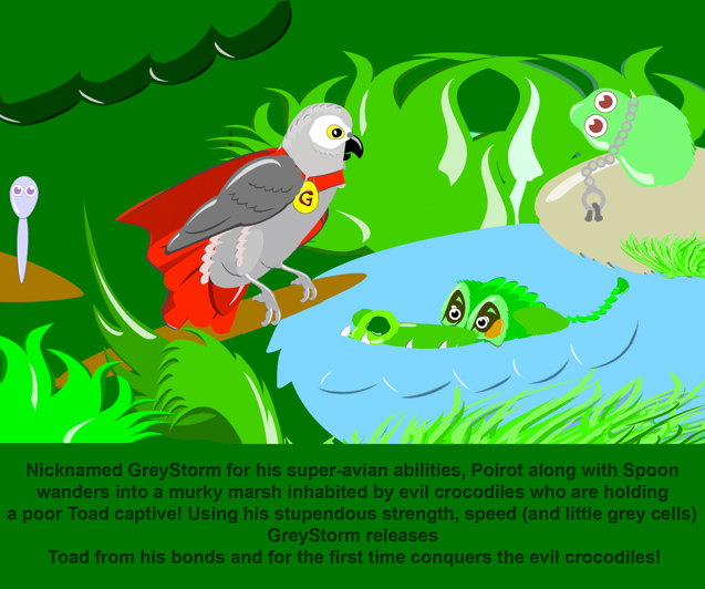 “Bloomer Boy, Iron Burd- focus!” “Bloomer, you’re always leaving your lava lamp on which is why I installed an auto shut off switch on a timer.” “Iron Burd, no birdie will be having dinner tonight if we don’t find Splatface and recover the Rainbow Twizzlers in the next two chapters.” “I added some iocane powder to my tea (I’ve built up a tolerance over the years and Hello Kitty Gurl had some stashed behind the nutmeg), which has enabled me to see exactly one hour into the future.” “If we don’t get over to Cloaca Street in the next 60 minutes, Splatface will have flown the coop to Avacado City, where no parrot ever dares tread.” “The RT’s and peace in Parrotdom will be lost forever!”