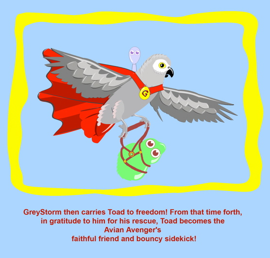 All of these entries are wonderful and I have enjoyed every single one of them. The Green Flash was so creative and Melissa’s human head parrot was adorable and funny. Professor Phantastic was fantastic and so perfect for a grey. I loved Traci’s drawing and her idea and who doesn’t like a greenwing terminator. Lance’s story touched me. In todays world real superheros can be hard to find. Under my Wing is very lucky to have Lance and he has my vote for Parrot Superhero.