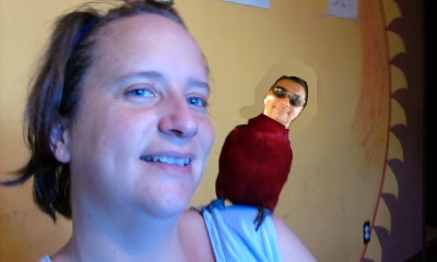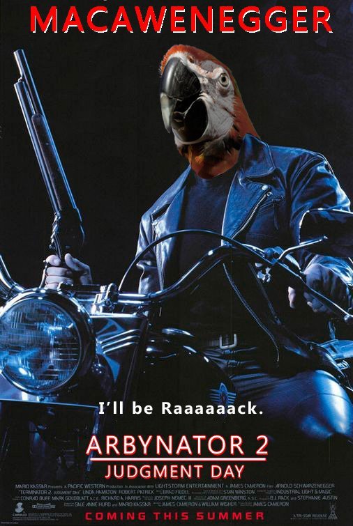 I’m the “Arbonator.” I’m from the future and have been sent back as a half-cyborg to help fight Parrot abuse and injustice. If you’re a bad guy watch out! My credo is “I’ll be Raaaaak” and I mean it. I work alone and don’t have a side kick or a sissy cape. My bionic-beak is enough to discourage abusers and save the day!