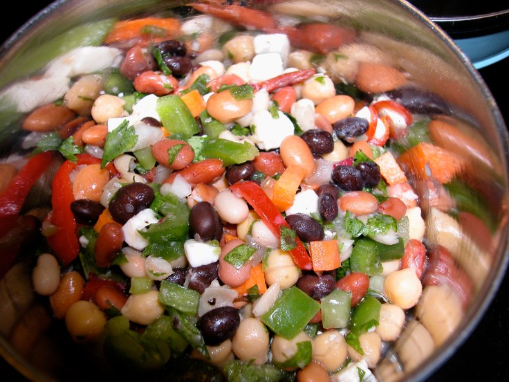 A bean, vegetable and feta cheese salad in a tiffin for work