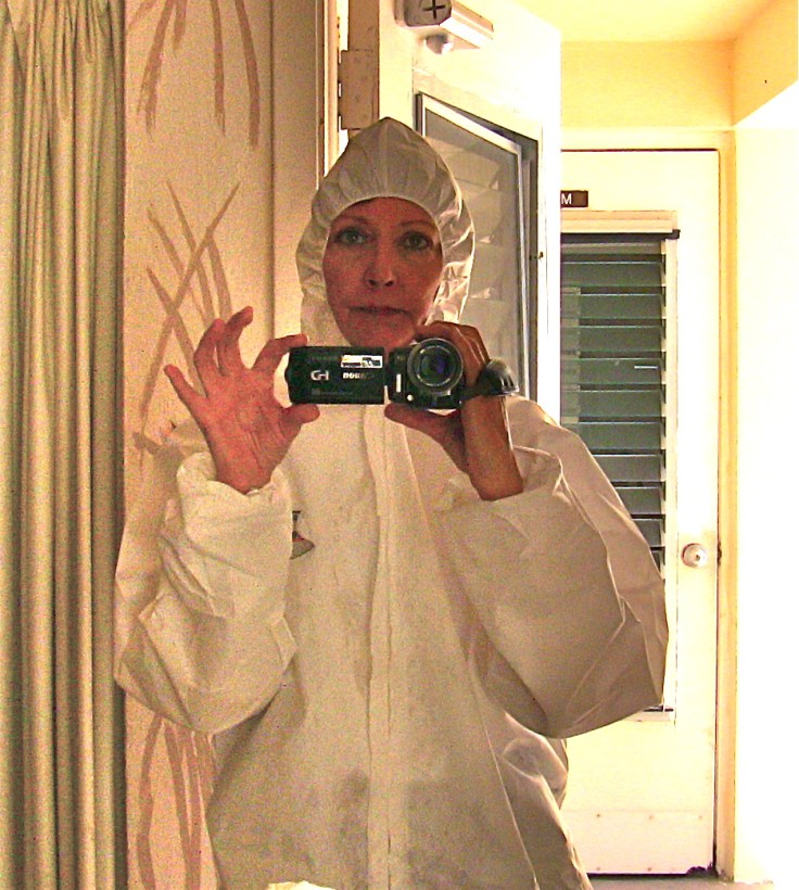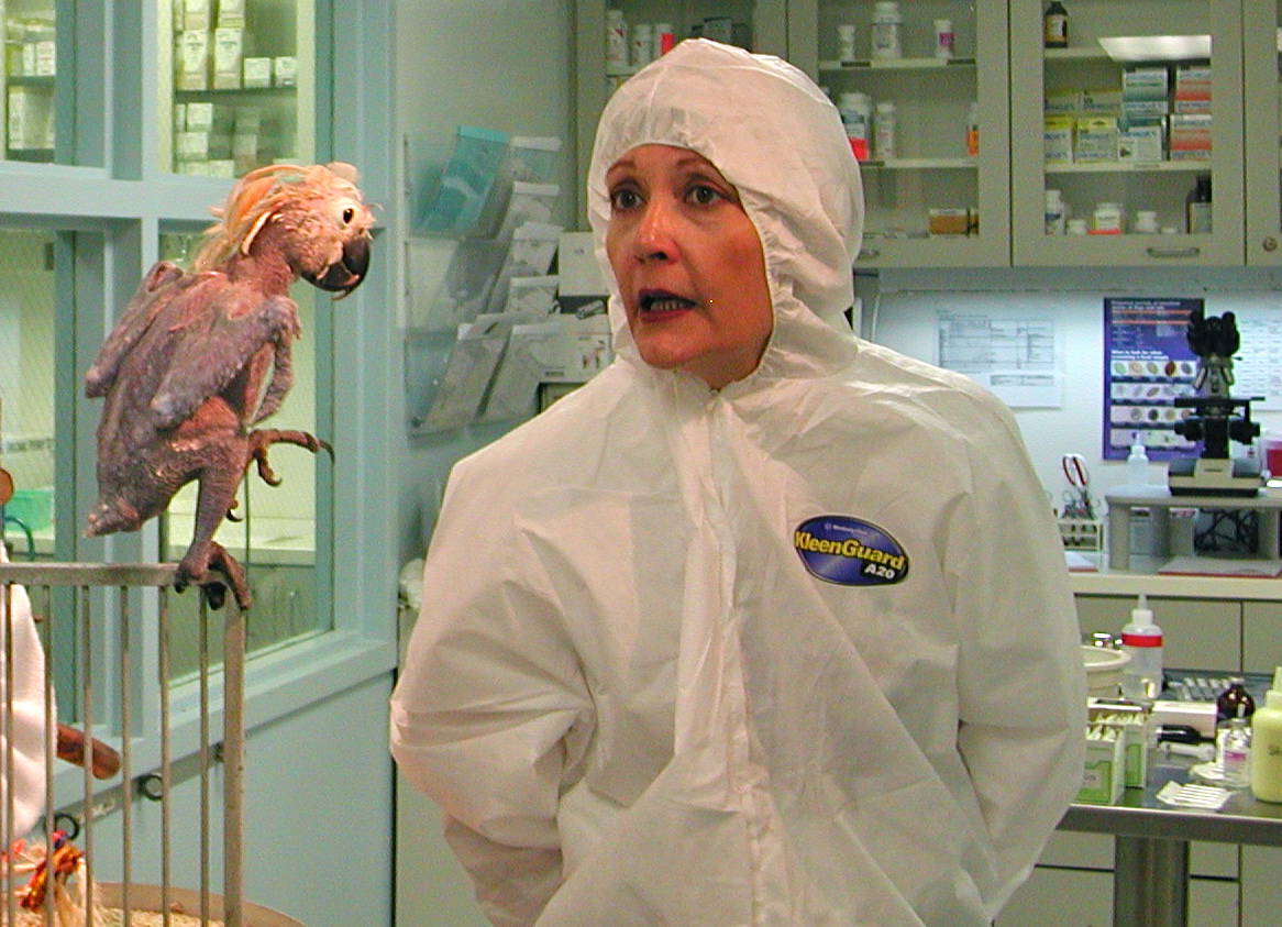 I know it’s a little odd suiting up like this just to visit a cockatoo, but I wasn’t about to take any chances. Just the thought of bringing PBFD home to my guys chills me. But being the bone-headed writer I am, I did what I needed to do in order to get the job done.