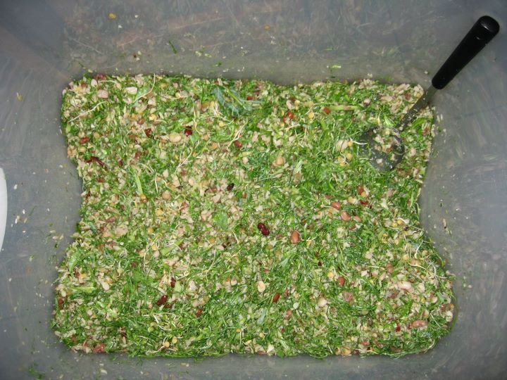 After reading Patricia Sund’s blog, and discussing Chop with her, he made his first batch. Bob’s Hyacinth picked through it and Chop made her more inquisitive compared to other foods. Now, she will take other foods without them being chopped, but Bob believes Chop initiated her curiosity towards other foods.