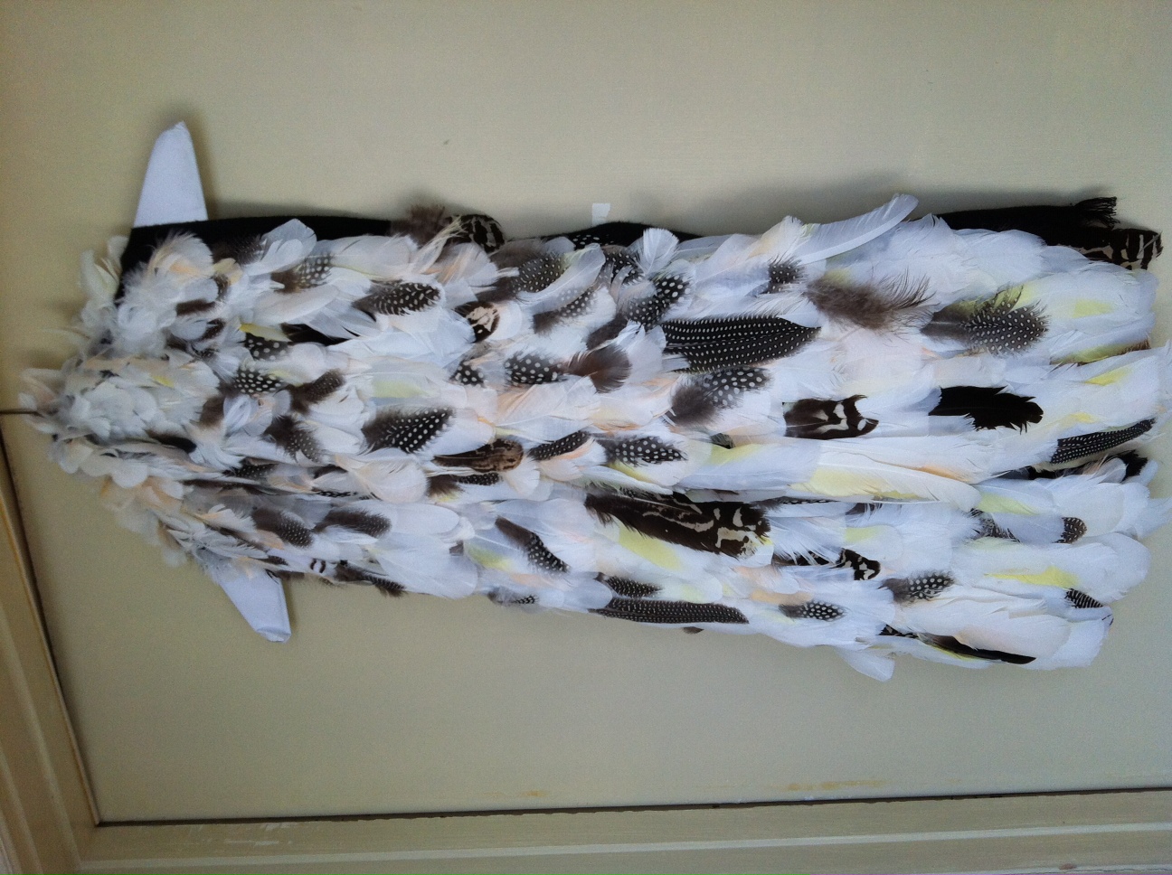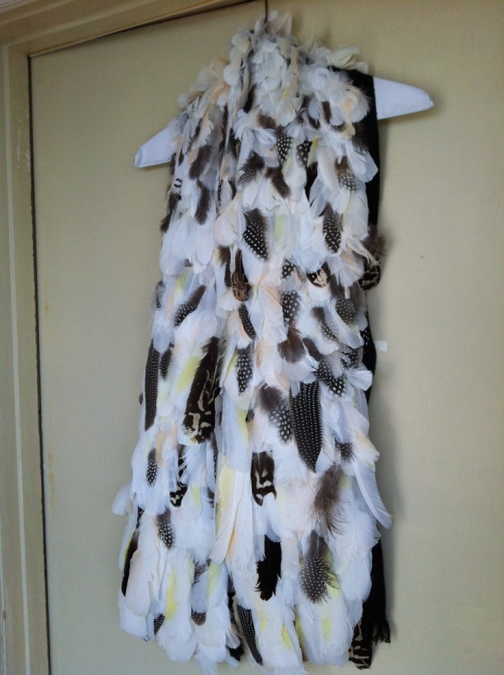 As you can see, I’ve been a little busy. I do this every year, busily chasing feathers around my living room, gluing my fingers together and hoping to produce a few items for the Houston Parrot Festival. This scarf, made of Cockatoo and Guinea fowl feathers was completed about an hour ago. It’s taken two full days, and I still have to hem the lining. But I think this little beauty might raise a little money for the NPRPF. Maybe I can make a matching pillow.