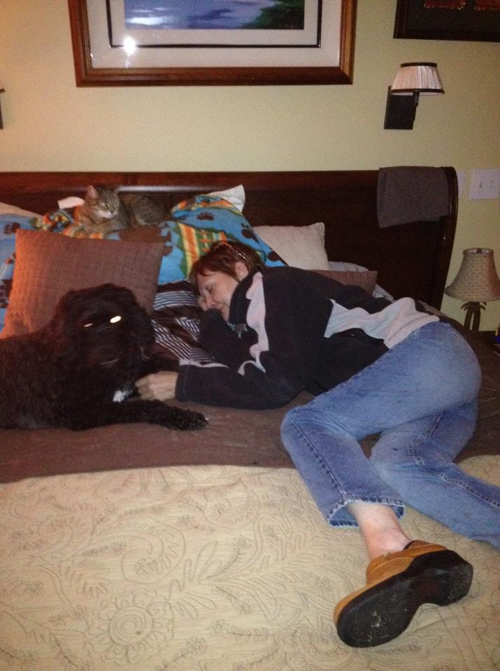 With Tango, Janet’s dog and Lily her cat, perched on the pillow above my head.