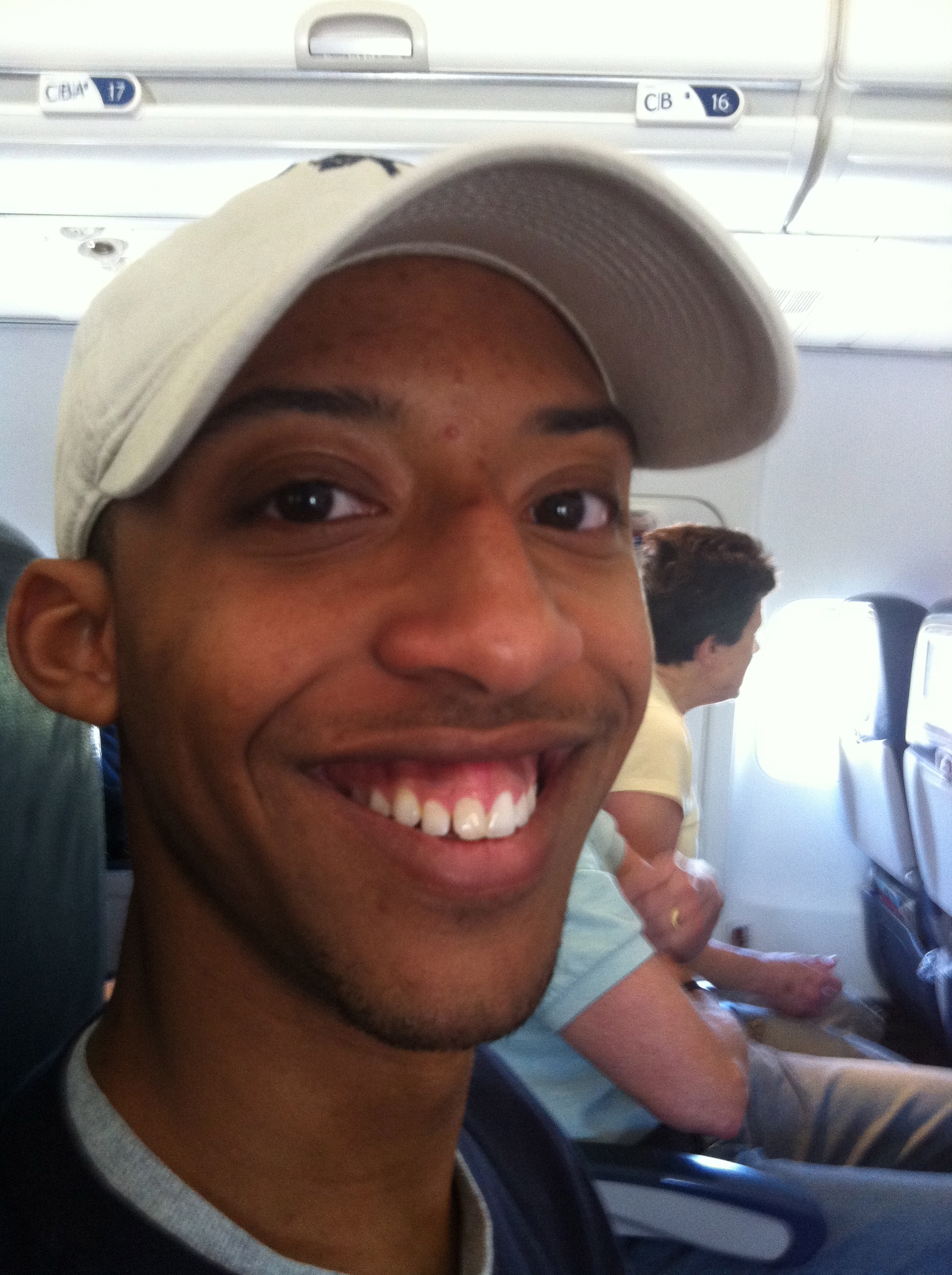 I made it to the gate with time to spare for a 9:35 departure. I called Janet and told her it was looking good to get on. The minute I got the boarding pass in my hand, I rang Janet and simply said, “I’m on. I’ll be there at 10: 51.” I found my seat which of course was the overwing exit row. Fine by me! I just happen to know how to operate those exits. My seat mate was a young guy reading Thomas Hardy. Kind of heavy material for such an early flight. So I said, “Thomas Hardy? At this hour?” We began talking and Jon, a student at Clemson, was a sharp guy and wanted to work n a museum doing restoration work. Very cool! Here’s Jon, rocking a bit of a Tiger Woods look. Don’t you think? Ironically, his Mom is Haitian and he freaked when I told him I had been to Haiti the day before. (Well, at this point about 14 hours before…)