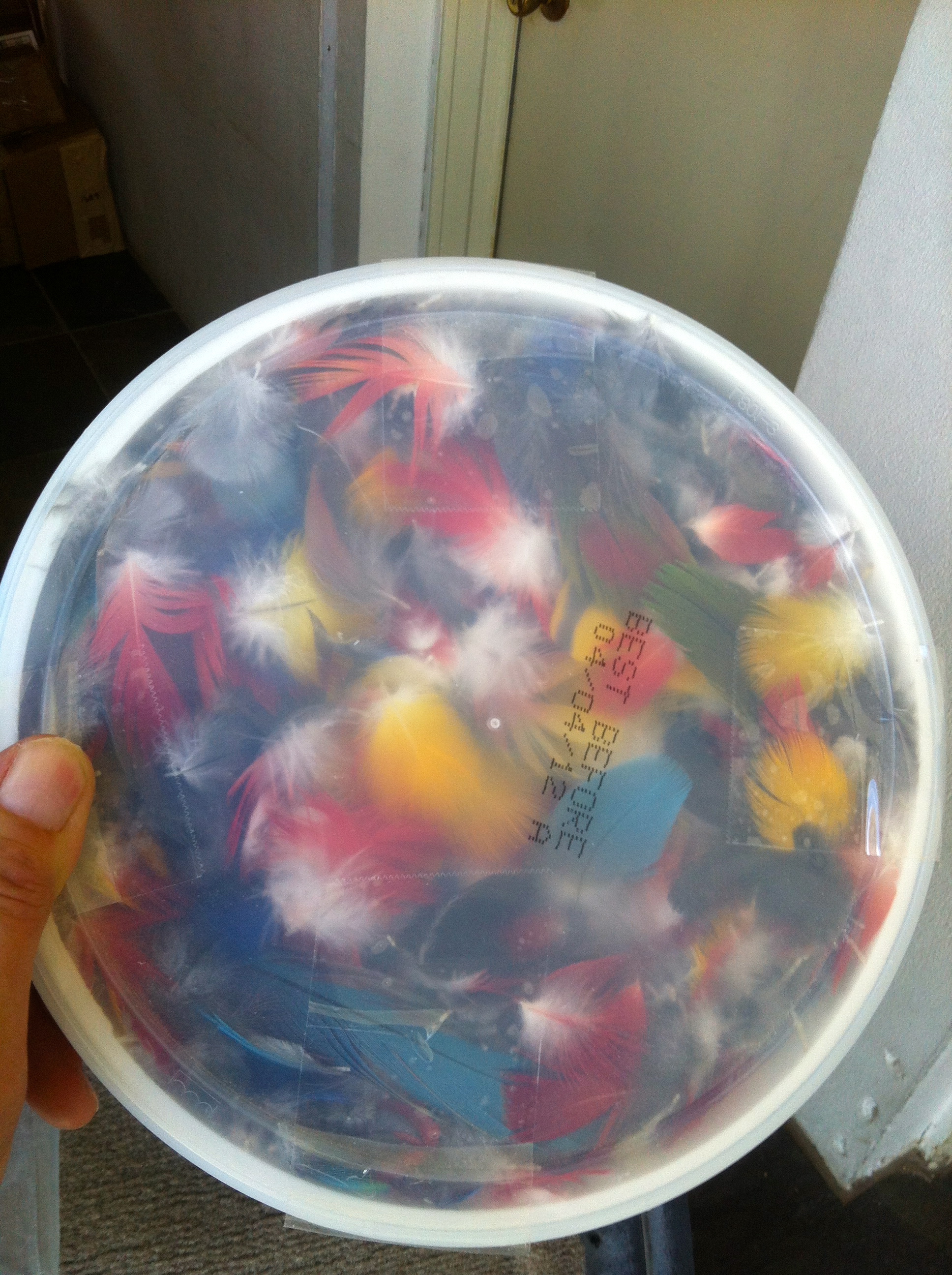 Some of you unfamiliar with one of my harebrained fund raising  schemes might wonder what in God’s name I would want with parrot feathers. Well, I make stuff with them, auction them off and the money goes to help various rescues around the country. This is one item I made: