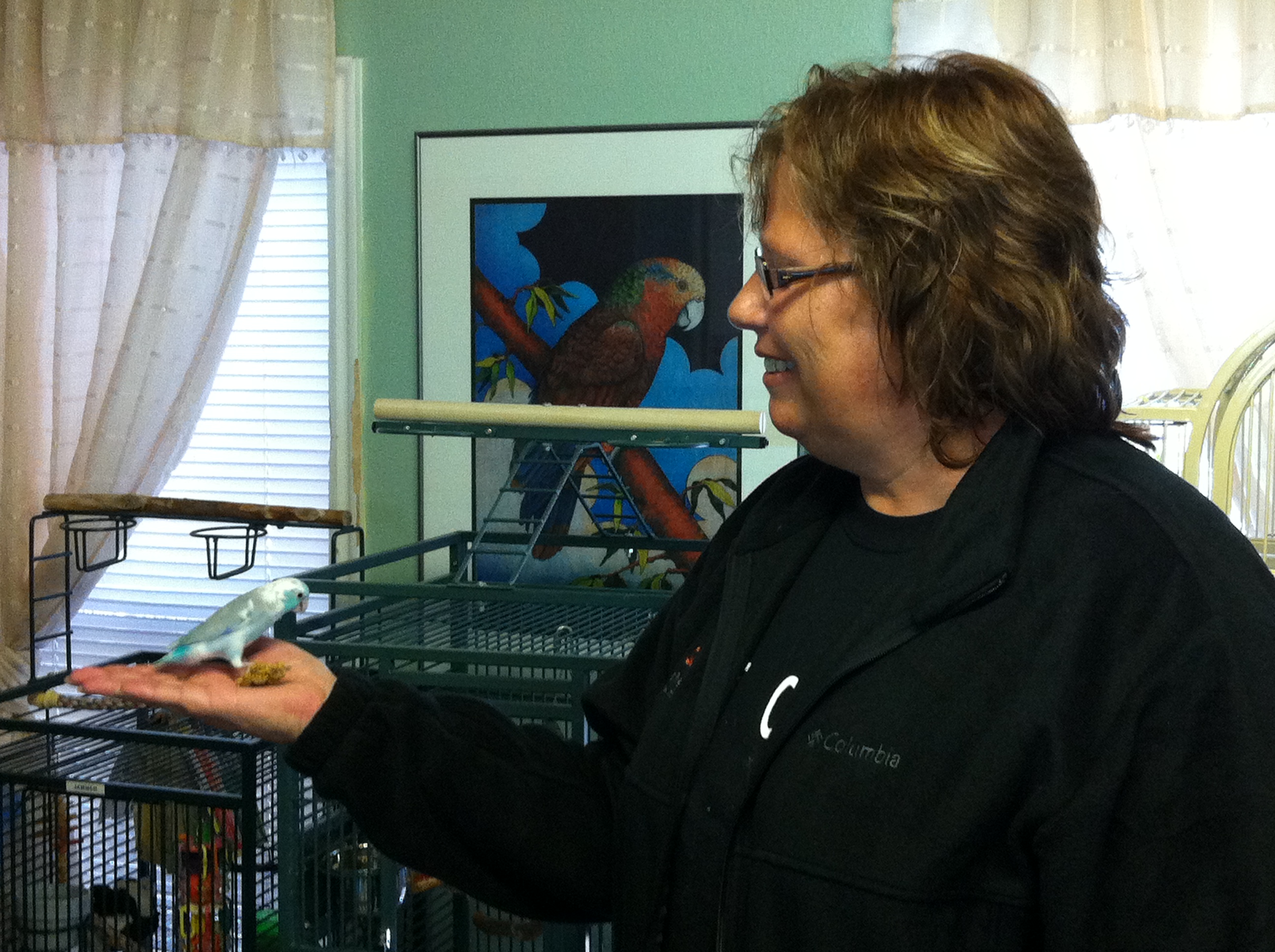 Bonnie got a little training time in with a parrotlet named Thai who had never really been handled before. Now this is parrot whispering. This took her about three minutes to accomplish. Not bad!