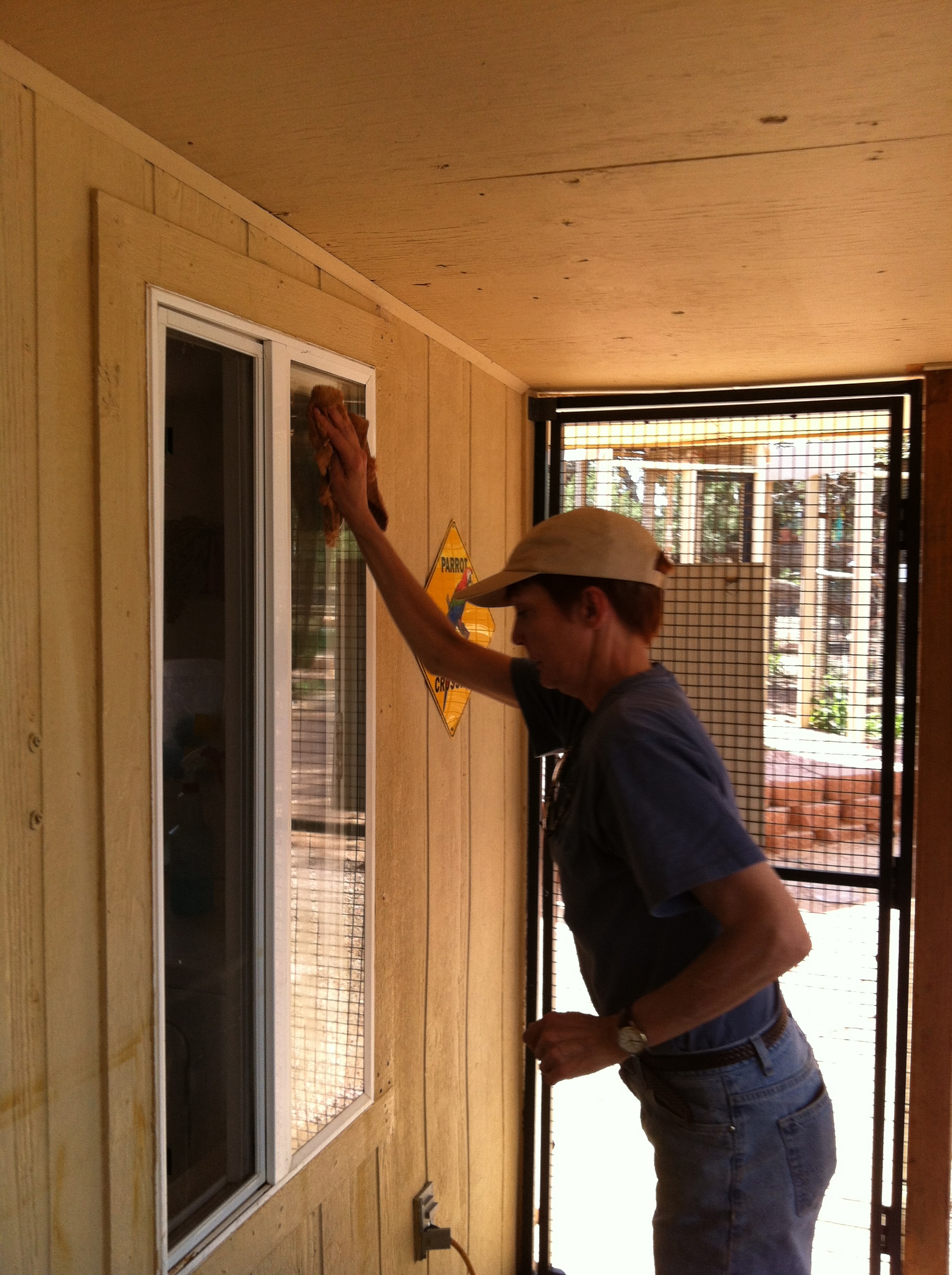 If there is one thing I always try to do at best Friends, it’s the jobs nobody else wants to do. One of them is cleaning. I learned that the way to endear yourself to the Staff is to clean. Clean anything. It doesn’t matter. The Staff is up to their eyeballs in volunteers, parrots and work. They are hard-pressed to find time to wash windows, scrub baseboards, wash framed photos, etc. So that’s what I do. Is it crucial? Well, not in the day-to-day operation. But eventually it has to be done. By somebody. Might as well be me. I just ram around cleaning stuff. So that’s what I did today: Windows, the laundry room, anything I could see that needed cleaning. It sure as hell made an impact.