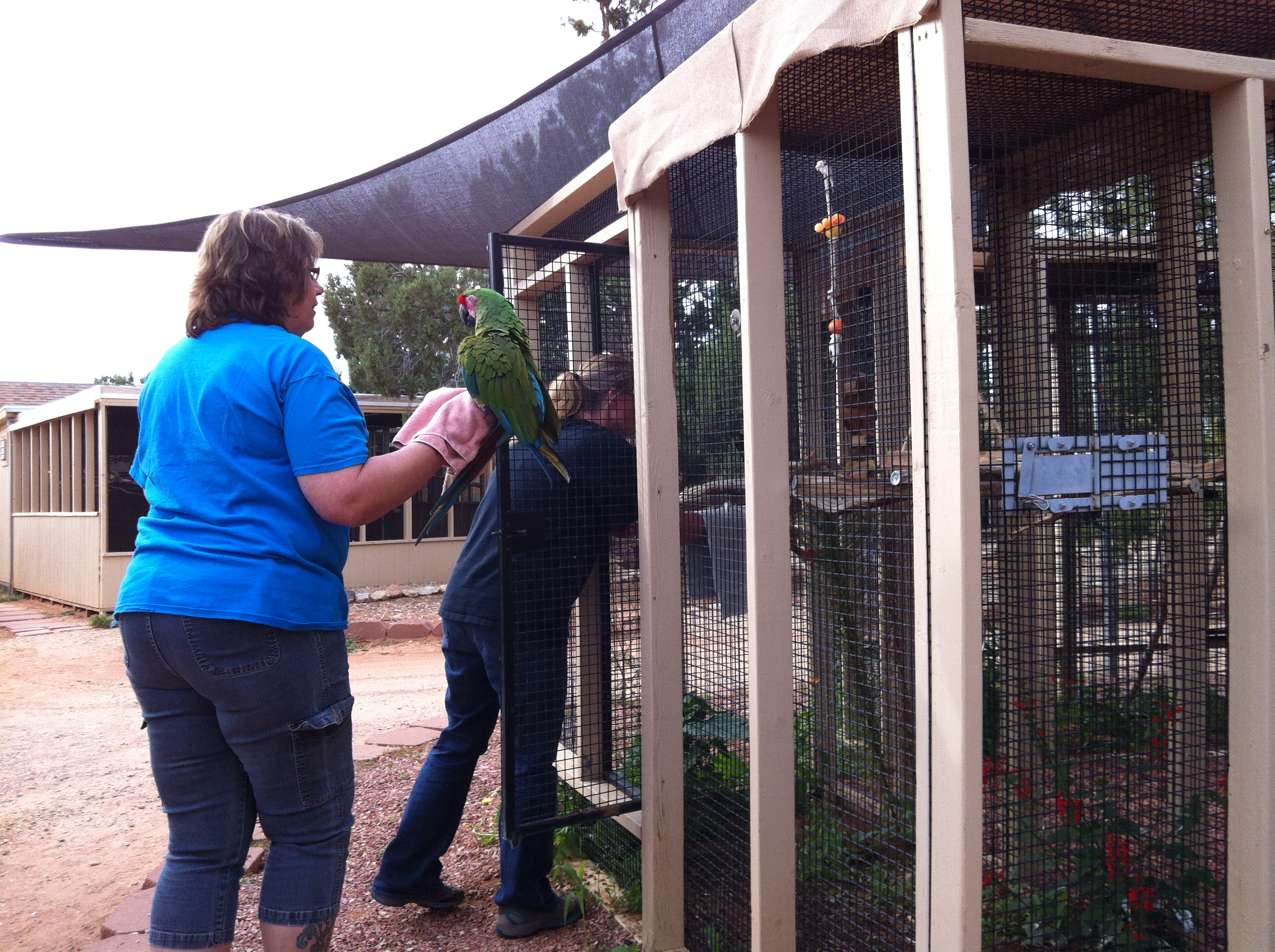 Bonnie and Kelly cleaned cages, socialized birds and did transfers of the birds from their inside cages to the outdoor aviaries for the day so they could be outdoors and grab some sun. Bonnie Worked with Jammer, a little Quaker as well as Thai, a little pale blue parrotlet.