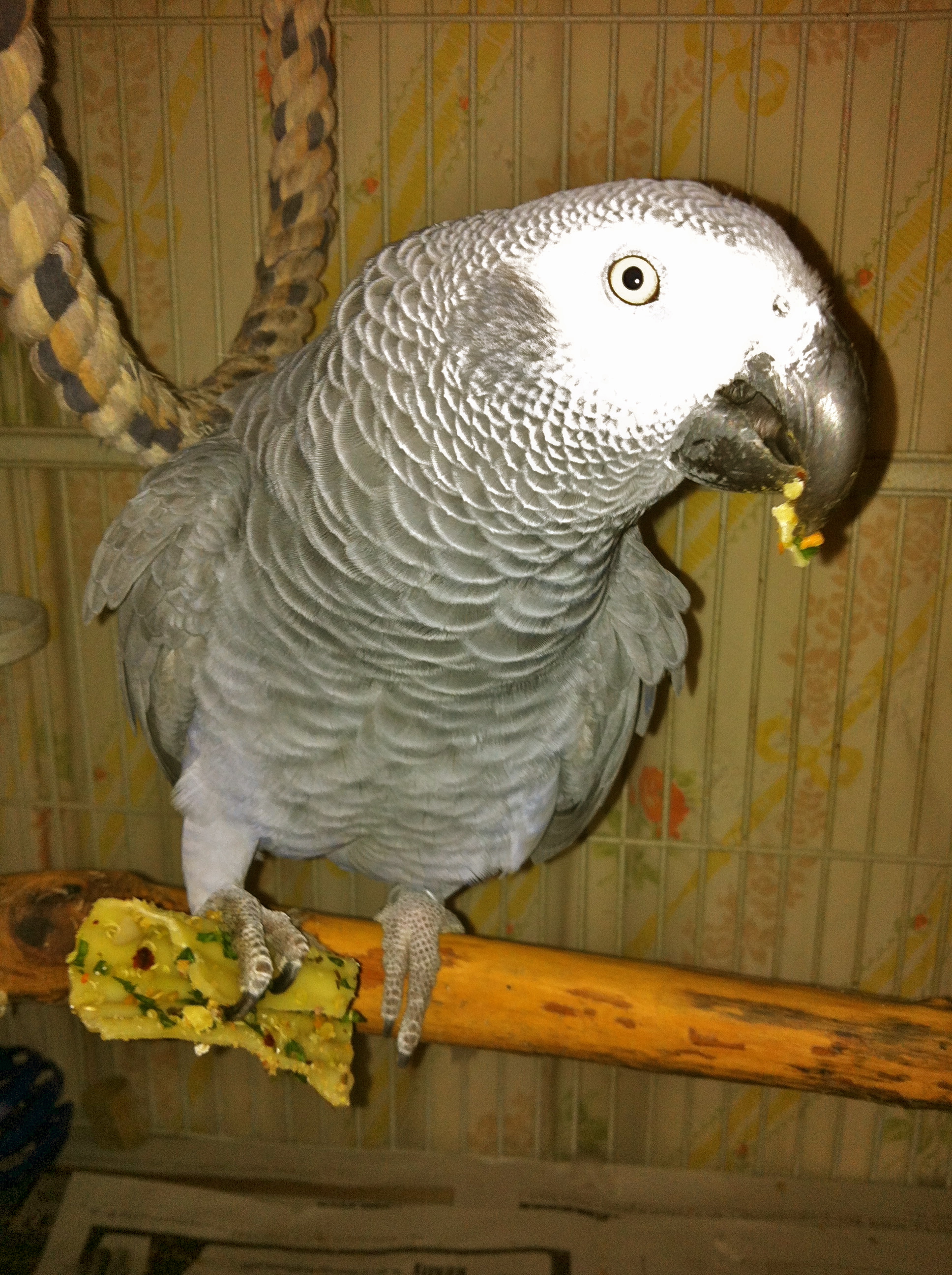 So I decided to make a point and go completely over the top. And I’ll continue to do it every once in a while just to make the point that birds have keen eyesight, and a great appreciation for color, more than we humans do. They like a nice texture and something that captures their eye and their tastebuds. It also made me appreciate my African Greys more. Why? Because of this: