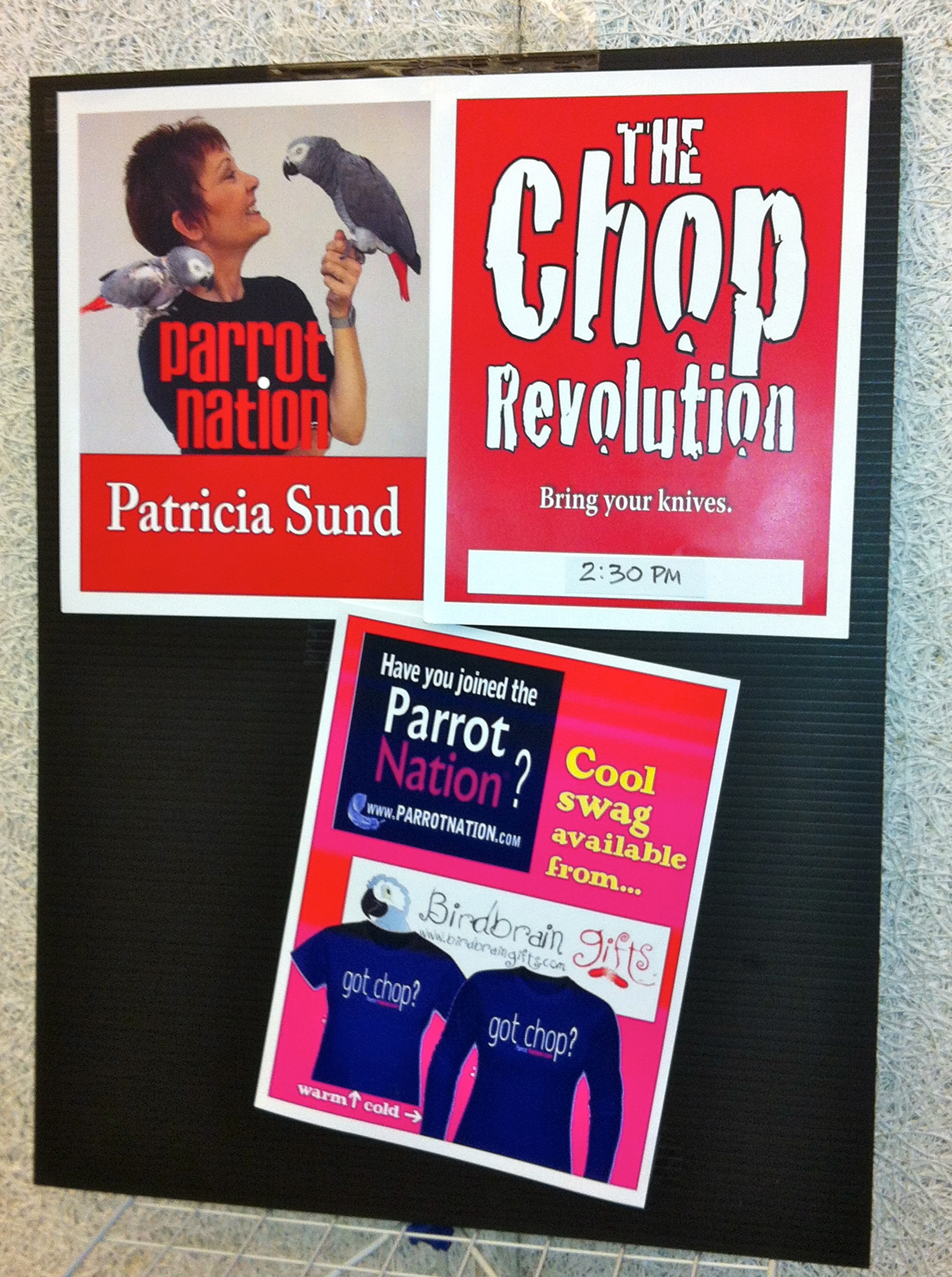 I attended the 2013 Midwest Bird Expo this past weekend. I was lucky enough to be a speaker and did my presentation, “The Chop Revolution.” Su Gould, who is an absolute whiz with graphics, designed this really cool sign for me to promote the presentation: