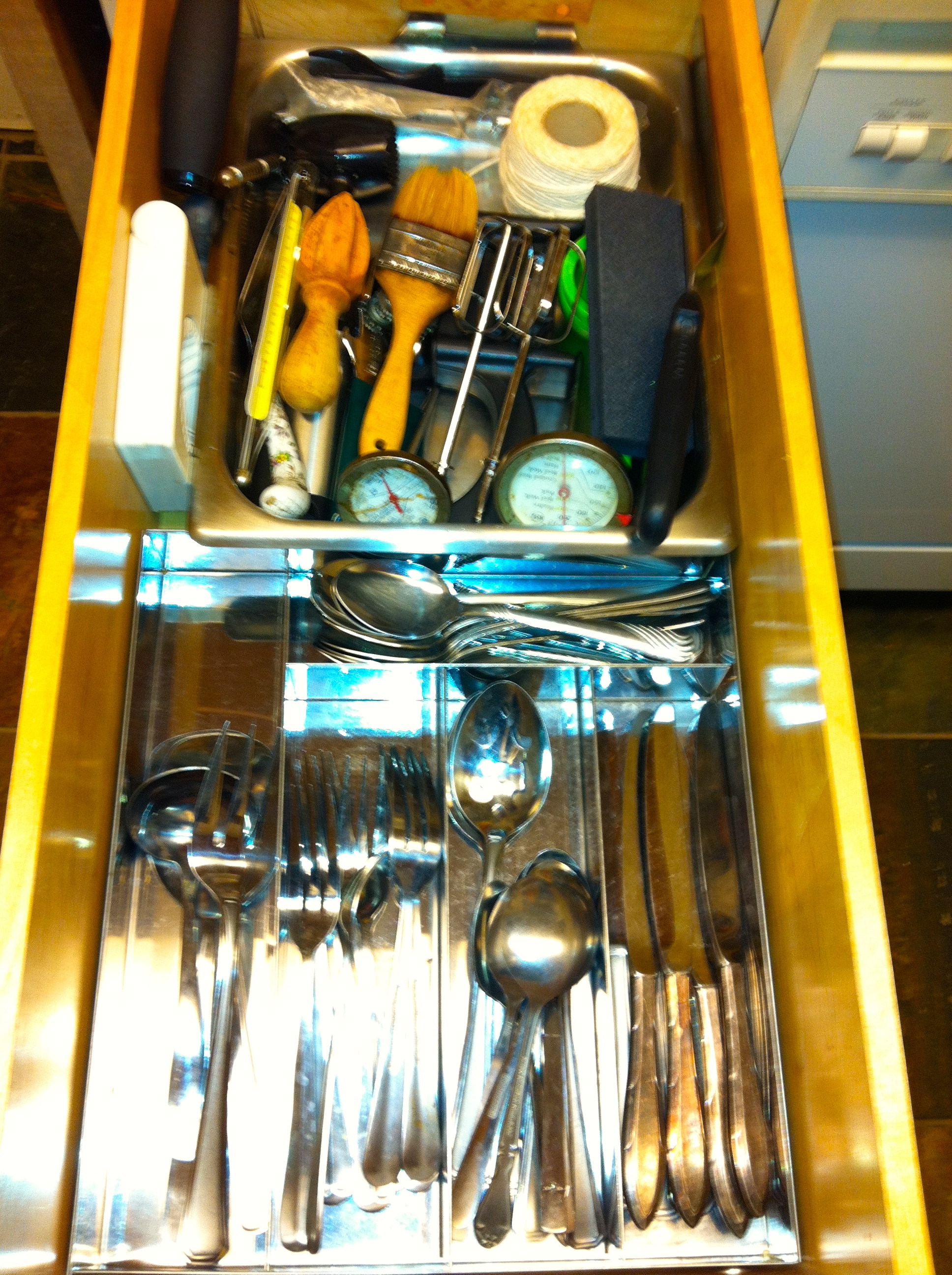 Empty out one kitchen utensil drawer in the kitchen. Yes, empty it out completely. It’s just one drawer. Wash the the inside of the empty drawer. Then begin editing what goes back in. Be neat, tidy and make it look nice.