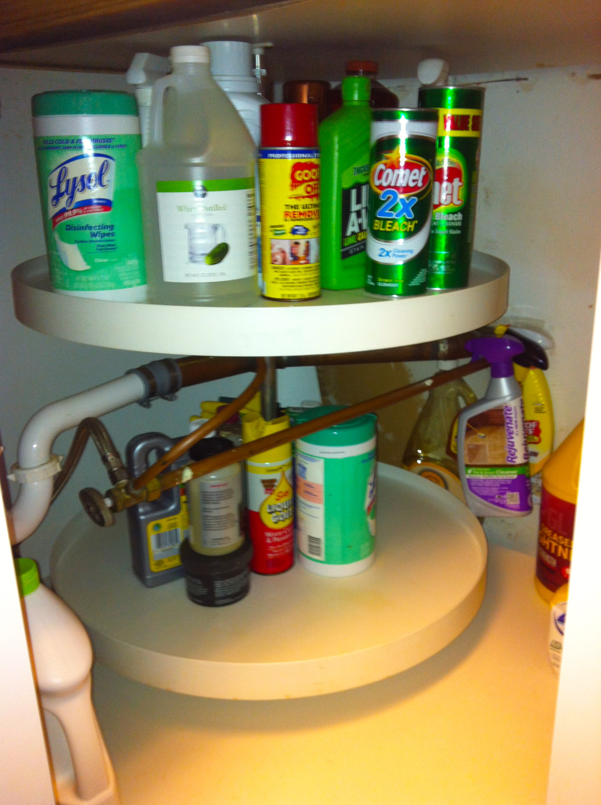 And even though the first task of the day looked worse than it was, it went far faster. I cleaned underneath my sink. Actually, my dishwasher is under my sink and this is a corner cabinet, but for intents and purposes, it contains the same things most people keep under their sink:
